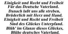 Государственный гимн как и государственный флаг Федеративной Республики Германия появился еще до революции 1848 г. Текст «Германской песни» был написан в 1841 г. на острове Гельголанд Августом Генрихом Хофманом фон Фаллерслебеном (1798-1874) на мелодию («Kaiserquartett») Йозефа Гайдна (1732-1809). На фоне тогдашней политической раздробленности Германии он отражал стремление народа к единому отечеству.