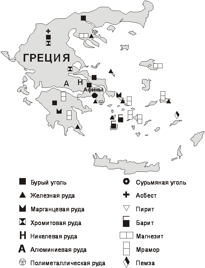 Минеральные ресурсы Греции очень разнообразны, однако запасы их, как правило, не велики, единственный топливный ресурс – бурый уголь, лигнит. Лишь с 1981 г. стали разрабатывать недавно открытые месторождения природного газа и нефти близ острова Тасос. С древними кристаллическими породами связаны важнейшие рудные месторождения. В окрестностях Афин, на островах Эвбея и Киклады, добываются железные руды на севере, в Макидонии встречается марганцевая руда, имеются никелевая, хромовая, медная, полиметаллические руды, бокситы. Богаче Греция нерудными ископаемыми – магнезитом, пемзой: на острове Наксос – крупнейшее в мире месторождение наждака. В изобилии имеются строительные материалы – известняки, песчаники, ценнейшие сорта мрамора.