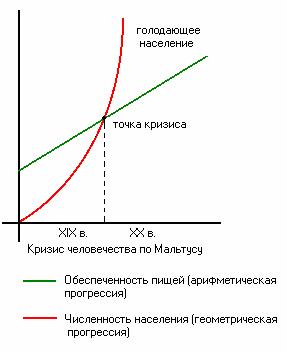 Т. Мальтус утверждал, что численность населения возрастает в геометрической прогрессии, в то время как пищевые ресурсы, необходимые для пропитания этого населения - в арифметической. Таким образом, рано или поздно, как бы медленно население ни росло, линия его роста пересечется с прямой пищевых ресурсов - арифметической прогрессией (на графике - точка Х). Когда численность населения достигнет этой точки, затормозить его рост могут только войны, нищета, болезни и пороки (необходимо отметить, что к этим способам борьбы с увеличивающимся населением он никогда не призывал, о чем довольно часто пишут трактователи его теории). В других изданиях своей книги Мальтус предлагал другие способы "торможения" роста численности населения: безбрачие, вдовство, поздние браки. Перенаселение в концепции Мальтуса - не только беда человечества, но определенное благо, которое заставляет многочисленных и ленивых от природы рабочих из-за конкуренции качественно трудиться за невысокую плату.