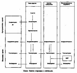 Исходным материалом для всех стероидных гормонов является холе-стерол, образующийся из ацетата или липопротеидов низкой плотности. Он поступает в яичник с током крови. В синтезе стероидов на первых этапах участвуют ФСГ и ЛГ, ферментные системы — ароматазы. Андрогены синтезируются в тека-клетках под влиянием ЛГ и с током крови попадают в гранулезные клетки. Конечные этапы синтеза (превращения андрогенов в эстрогены) происходит под влиянием ферментов.