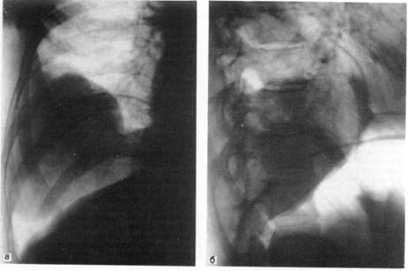 а — прямая рентгенограмма; б — боковая рентгенограмма.
