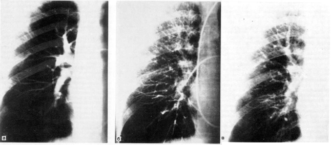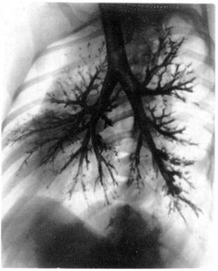 Бронхография легких может быть выполнена под наркозом. Особенность ее проведения заключается в том, что больной лежит на спине, осуществляется искусственная вентиляция легких в условиях миорелаксации. Контрастное вещество вводят через интубационную трубку и в период кратковременного апноэ выполняют рентгенограммы обоих легких в прямой и косых проекциях (рис. 5).