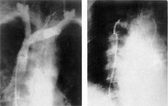 При селективной ангиографии бронхиальных артерий катетер вводится в грудную аорту и далее — до устья бронхиальных сосудов; введение контрастного вещества осуществляется с помощью автоматического инъектора. Сериография, проводимая, как правило, в переднезадней проекции, может быть дополнена рентгенограммами в боковой или косой проекциях в зависимости от задач исследования (рис. 7).