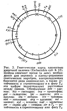 У бактерий, к-рые являются гаплоидными организмами, имеется одна, чаще всего непрерывная, кольцевая хромосома и все гены образуют одну группу сцепления (рис. 2). При переносе генетич. материала из клетки-донора в клетку-реципиент, например при конъюгации, кольцевая хромосома разрывается и образующаяся линейная структура переносится из одной бактериальной клетки в другую (у кишечной палочки в течение 110-120 мин). Искусственно прерывая процесс конъюгации, можно по возникшим типам рекомбинантов установить, какие гены успели перейти в клетку-реципиент. В этом состоит один из методов построения Генетических карт хромосом бактерий, детально разработанных у ряда видов. Ещё более детализированы Генетические карты хромосом нек-рых бактериофагов