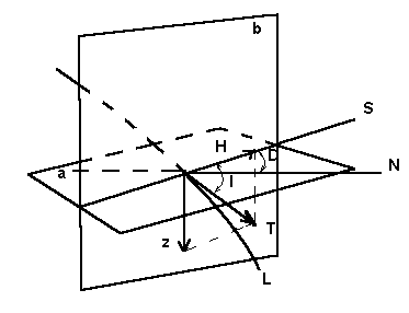Магнитное поле является векторным, поэтому его интенсивность характеризуется не только напряженностью, но и положением в пространстве (рис.12). Во внешнем поле этот вектор Т направлен по касательной к магнитной силовой линии L и в вертикальной плоскости может быть разложен на горизонтальную Н и вертикальную z составляющие: