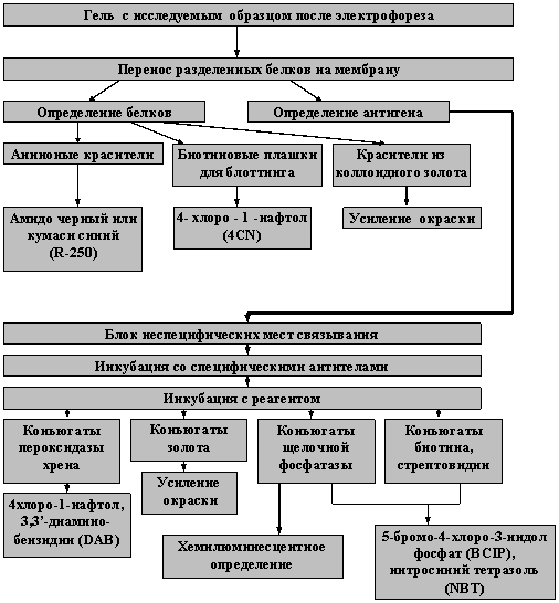Схема: Основные методы окраски в иммуноблотинге (Western-blot).