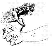 При укусе змеи уложите пострадавшего и обеспечьте ему покой. Наложите стягивающую повязку со стороны сердца - но не настолько тугую, чтобы прекратилось кровообращение. Если нет условий для оказания полноценной помощи, опустите укушенную часть по отношению к телу. Всячески успокаивайте пострадавшего. Пить не давайте.