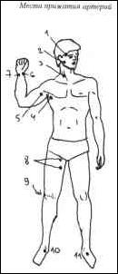 Артериальное кровотечение. При этом кровь идет из раны пульсирующей струйкой ярко-алого цвета. Необходимо как можно быстрее остановить кровотечение, от этого часто зависит жизнь пострадавшего. Следует пережать артерию, которая снабжает раненый участок тела кровью. Обычно прижимают артерию пальцем к кости там, где она проходит близко, выше места раны (см. рисунок). Для транспортировки обычно бывает необходимо наложить кровоостанавливающий жгут или закрутку. Это является ВРЕМЕННОЙ мерой остановки кровотечения до врачебного вмешательства. Жгут накладывают ВЫШЕ места ранения. Чтобы не повредить ткани тела, под жгут следует положить что-нибудь мягкое. Жгут должен находиться на места прижатия артерий конечности не более 2 часов летом и 1 часа зимой, так как это может привести к омертвению конечности. Если по истечении этого срока не будет оказана медицинская помощь и кровотечение не будет остановлено, то жгут ослабляют на 3-5 минут и снова затягивают его рядом, но уже не более чем на 45 минут. К жгуту следует прикрепить бумажку и на ней отмечать время каждой затяжки.