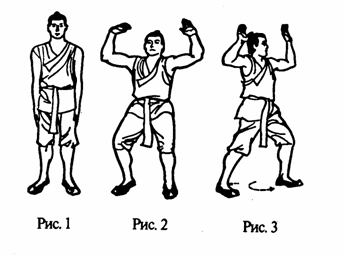 2. Руки свободно поднимаются вперед-вверх (ладонь против ладони) до положения выше головы, чтобы точки хэгу* были друг против друга (рис. 2). Затем руки расходятся в стороны, ладони поворачиваются кверху. Тяжесть тела одновременно перенести на правую ногу, а левая