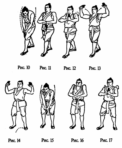 Затем обе руки идут сверху вниз, рисуя полукруг. Одновременно туловище сгибается и наклоняется вперед. Тяжесть тела переносится на левую ногу (рис. 10). Когда обе руки дойдут до колена левой ноги, ладони смыкаются и поднимаются вверх вдоль живота. Тяжесть тела перемещается на правую ногу (рис. 11). Когда сомкнутые ладони дойдут до груди и плечи опишут круг, повернуть их вверх в жесте приветствия (рис. 12). Затем ладони разомкнуть, руки поднять вверх, развести в стороны, рисуя дугу. Туловище наклонить вперед, тяжесть тела перенести на левую ногу и принять позу кошки в прыжке (рис. 13). Упражнение выполнялось в южном направлении.