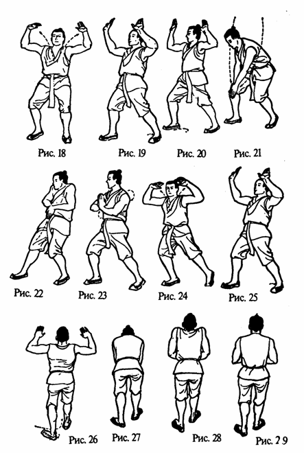 Теперь пятку левой ноги чуть приподнять, а ступню повернуть влево на 45°. Тяжесть тела переносится на левую ногу. Одновременно туловище поворачивается вправо на 90° (рис. 19). Правая нога идет назад, а затем на полшага вперед-влево, рисуя иероглиф „человек" ( \/<) -. Пятка левой ноги поворачивается влево на 45 (рис. 20). Руки опустить в стороны-вниз, описывая дугу. Одновременно туловище сгибается и наклоняется вперед (рис. 21). Когда руки дойдут до колена правой ноги, ладони необходимо сомкнуть. Руки перемещаются вверх вдоль живота. Тяжесть тела переносится на левую ногу (рис. 22). Когда сомкнутые ладони дойдут до груди и плечи опишут круг, повернуть их вверх в жесте приветствия (рис. 23). Затем ладони разомкнуть, руки поднять вверх, развести в стороны, рисуя дугу. Туловище наклонить вперед, тяжесть тела перенести на правую ногу (рис. 24). Упражнение выполняется в западном направлении.