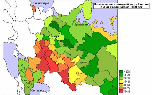 Площади лесов на территории России постоянно сокращаются вот уже 500 лет, но, безусловно, наиболее резко - в ХХ в. Но все же этот процесс затронул Россию в меньшей степени, чем основной мир. Считается (Виноградов и др.) [3], что в последние 10 тыс. лет было сведено 2/3 лесов Евразии. Для России этот показатель не оценивался, но он, безусловно, меньше 1/3.