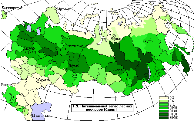 Россия обладает самыми большими в мире запасами леса. На 1993 г. площадь лесной части лесного фонда составляла 886.5 млн.га, а общий запас древесины - 80.7 млрд. м3, что составляет соответственно 21.7 и 25.9% мировых запасов. Превышение второй цифры над первой говорит о том, что Россия располагает более зрелыми и более продуктивными лесами, чем остальная планета в целом.