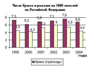 Рис. 3 Число браков и разводов на 1000жителей за 1995-2004гг.