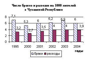 Неблагоприятно сказывается на ситуации с рождаемостью ухудшение положения с брачностью населения. В 2004 году по сравнению с 2003 годом по всей стране в целом коэффициент брачности снизился до 6,8 брака в расчете на 1000 жителей с 7,6 в 2003 году, а в Чувашской Республике до 6,0 с 6,9.