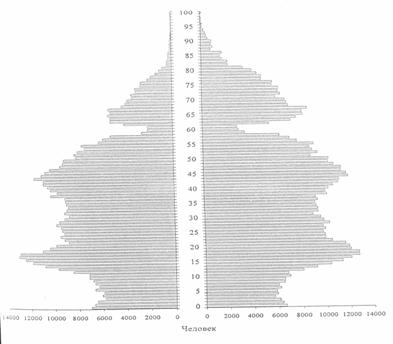 Половозрастная структура населения является «запечатленной демографической историей». На рис. 4 показана половозрастная структура населения Чувашии в 2004г., хранящая следы демографических потрясений.