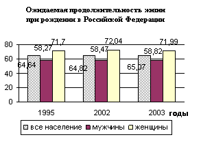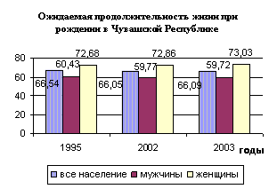 Продолжительность жизни граждан -признанный индикатор социально-экономического благополучия любого общества. Согласно прогнозам Госкомстата России ожидаемая предстоящая жизнь при рождении в 2003 году в Чувашской Республике состав-66,09 года, что на 1,02 года больше, чем по Российской Федерации (65,07г.). Следует отметить, что ожидаемая продолжительность жизни у женщин намного выше чем у мужчин как по России в целом так и в нашей республике.