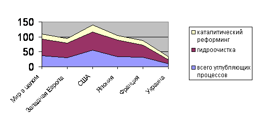 Рисунок №4 Мощность углублубляющих процессов (% от атмосферной перегонки) в мире и отдельных странах. [6,19]