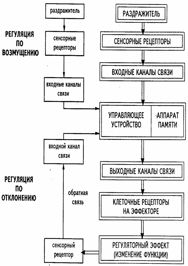 Рис.1. Блок-схема системы регуляции. Двойные рамки и стрелки — основные элементы, одинарные рамки и стрелки — звенья регуляции по возмущению и отклонению.