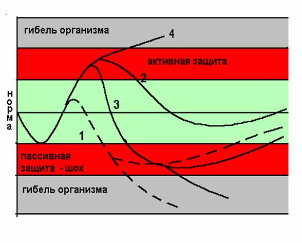 Первый вариант характеризуется минимальным включением систем активной защиты. Он типичен для более низких ступеней развития животного мира. У высших позвоночных и человека встречается редко. В этом случае в ответ на агрессию развивается минимизация жизненных процессов – своеобразный аналог шока, отмечаемого у человека. В зависимости от интенсивности травмы процесс заканчивается либо гибелью организма, либо выздоровлением. Во втором варианте, в отличие от первого, выражена стимуляция систем активной защиты. При их состоятельности и ликвидации угрозы для жизни происходит нормализация измененных параметров. Включения средств пассивной защиты не происходит, и шок не развивается. Для третьего варианта типичен выраженный комплекс реакций активной и пассивной защиты. Однако максимальная стимуляция систем активной защиты оказывается несостоятельной. Это приводит к развитию комплекса пассивных оборонительных реакций — шока. Как и в первом варианте, этот процесс заканчивается либо гибелью, либо выздоровлением особи. И, наконец, последний вариант характеризуется неадекватной (чрезмерной) стимуляцией механизмов активной защиты. Это приводит, по-видимому, к «полому» систем регуляции и своеобразному «энергетическому кризису» из-за недостаточного обеспечения тканей' кислородом. Происходит быстрая гибель организма вследствие остановки дыхания и сердца на фоне повышенной двигательной активности, гипертермии и т. п.