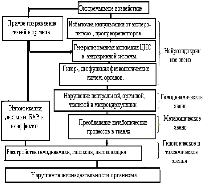 Для ответа на вопрос, звучащий в названии этого реферата необходимо также сравнить причины гемодинамических расстройств при шоке, коллапсе и массивной острой кровопотере. Считается, что при шоке изменения кровообращения возникают вторично, главным образом в результате нарушения деятельности центральной нервной системы. Экстремальное воздействие (этиологический фактор шока) действует двояко : вызывает прямое повреждение тканей и органов, а также вызывает избыточную афферентную импульсацию от экстерорецепторов, интерорецепторов и проприорецепторов. Оба этих процесса вызывают генерализованную активацию нервной и эндокринной систем, это приводит к гиперфункции и дисфункции различных физиологических систем, что и является причиной гемодинамических расстройств. В общем виде основные звенья патогенеза шока представлены на рисунке 2.