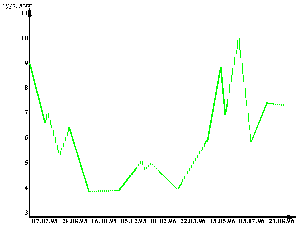 Динамика курса акций РАО «Норильский никель» в 1995—96 годах видна на диаграмме: