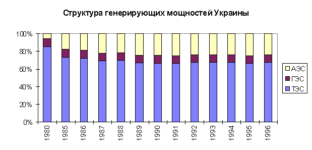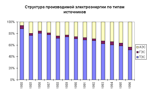 Если произвести структуризацию объема производимой энергии по типу генерирующего источника, то ситуация будет следующей. Производство электроэнергии атомными станциями постоянно возрастало (за исключением 1986 г., что обусловлено аварией на Чернобыльской АЭС). В то же время в тепловой энергетике падение происходило ускоренными темпами. В результате, доля ТЭС в общем объеме произведенной энергии в 1996 г. составила 51.7%, АЭС - 43.5%. По итогам 1997 г. прогнозируется повышение доли АЭС до 52%.
