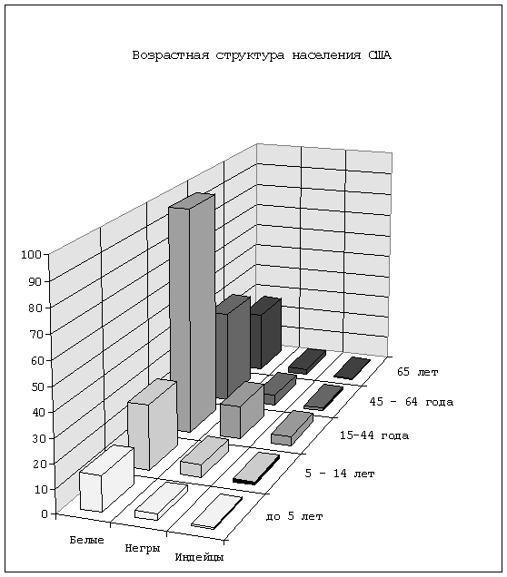 Возрастную и половую структуру населения США можно оценить по приведенным ниже диаграммам, которые составлялись по данным 1986 года. Общая численность населения тогда составляла 241,5 млн. человек (без учета военнослужащих и других граждан США за пределами территории 50 штатов страны).