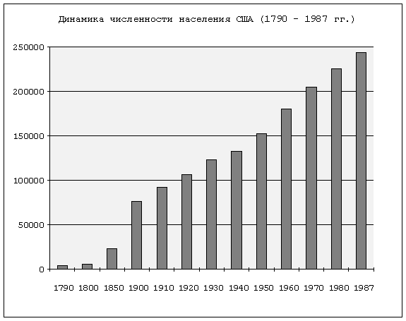 Динамику численности населения США (в тыс. человек) за 1790 - 1987 гг. мы можем видеть на следующей диаграмме.
