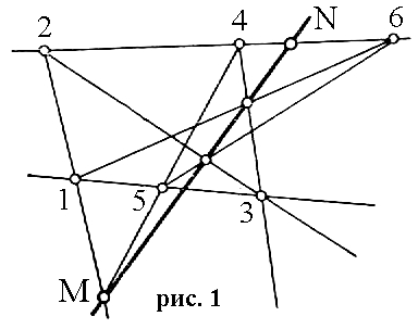 «Математическое собрание» Паппа имеет для истории математики большое значение: оно содержит обзор трудов предшественников Паппа, развивает некоторые их идеи, комментирует эти труды. Благодаря этому для нас сохранились сведения о многих математических работах древних, которые не дошли в подлинниках до нашего времени. Кроме того, в работе Паппа имеются и некоторые новые и оригинальные открытия. Так как Папп не всегда называет авторов приводимых им теорем, то нам трудно судить, какие теоремы принадлежат ему самому и какие - другим авторам. Но по отношению к некоторым из них считают несомненным, что они принадлежат Паппу. Многие из этих теорем имеют значительный теоретический и практический интерес. Теорема Паппа об инволюции точек читается так: «Если на двух прямых, лежащих в одной плоскости, взять по три точки: на первой прямой точки 1, 5 и 3, а на второй—2, 4 и 6, то точки пересечения пар прямых 1—2 и 4—5, 2—3 и 5—6, 3—4 и 6— 1 лежат на одной прямой МN (рис. 1).