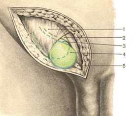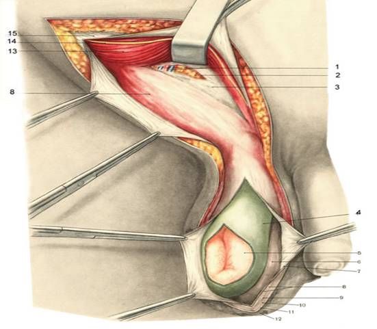 1 — a. et v. epigastrica inferior; 2 — предбрюшинная жировая клетчатка; 3 — fascia transversalis; 4 — грыжевой мешок; 5 — тонкая кишка; 6 — tunica va-ginalis testis; 7 — fascia spermatica int.; 8 — fascia cremasterica et m. cre-master; 9 — fascia spermatica ext.; 10 — tunica dartos; 11 — кожа; 12 — scrotum ; 13 — m. obliquus internus abdominis; 14 — n. ilioinguinalis; 15 — апоневроз m. obliqui externi abdominis.