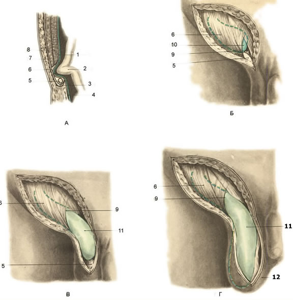 1 — fascia transversalis; 2 — тонкая кишка; 3 — lig. inguinale; 4 — peritoneum; 5 — funiculus spermaticus; 6 апоневроз m. obliqui externi abdominis; 7 — m. obliquus internus abdominis; 8 — m. transversus abdominis; 9 anulus inguinalis superficialis; 10 — дно грыжевого мешка; 11 — грыжевой мешок; 12 — scrotum.