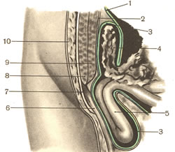 1 — peritoneum; 2 — fascia transversalis; 3 — грыжевой мешок; 4 — сальник; 5 — тонкая кишка; 6 — funiculus spermaticus; 7 — апоневроз m. obliqui externi abdominis; 8 — m. obliquus internus abdominis; 9 — m. transversus abdominis; 10 — кожа.