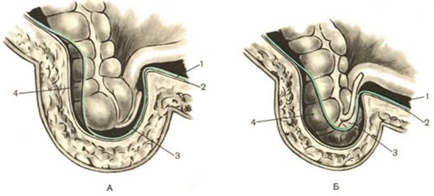 23. Скользящие грыжи слепой кишки. А — околобрюшинная скользящая грыжа (в образовании латеральной стенки грыжевой опухоли принимает участие слепая кишка); В — внебрюшинная скользящая грыжа (стенка кишки на большом протяжении является грыжевой опухолью).