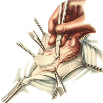 Апоневроз наружной косой мышцы живота тщательно отслаивают от подкожной жировой клетчатки и рассекают по желобоватому зонду (рис. 27). Образовавшиеся в результате этого лоскуты апоневроза захватывают зажимами, растягивают в стороны и тупфером отделяют от подлежащих тканей: внутренний лоскут — от m. obliquus internus abdominis, а наружный — от семенного канатика, выделяя при этом желоб паховой связки (рис. 28). Вдоль семенного канатика осторожно рассекают fascia cremasterica, m. cremaster, поперечную фасцию и обнажают грыжевой мешок, а также элементы семенного канатика. Грыжевой мешок тщательно отделяют от окружающих тканей пальцем, обвернутым марлевой салфеткой, тупфером или инструментом, начиная от дна к шейке, до полного его освобождения (рис. 29). Следует помнить, что в тканях, прилежащих к наружной поверхности грыжевого мешка, располагается подвздошно-паховый нерв, который во избежание повреждения необходимо сместить кнаружи. Выделенный грыжевой мешок у дна захватывают двумя пинцетами и осторожно, избегая повреждения содержимого, вскрывают (рис. 30). При наличии спаек между стенкой мешка и грыжевым содержимым (сальник, кишка) их разъединяют, а содержимое осматривают и вправляют в брюшную полость (рис. 31). После этого стенку мешка рассекают по длине до шейки. Шейку грыжевого мешка как можно проксимальнее прошивают под контролем зрения и концы нитей завязывают вначале на одной, а затем на другой стороне (рис. 32). Во время прошивания шейки и завязывания лигатур грыжевой мешок следует хорошо подтянуть, чтобы не захватить в шов стенку кишечной петли или сальник. Периферическую часть грыжевого мешка дистальнее наложенной лигатуры отсекают (рис. 33). Убедившись, что нет кровотечения из культи грыжевого мешка, срезают концы нитей, а на рассеченную fascia cremasterica накладывают несколько узловых кетгутовых швов. На этом заканчивается первый этап операции грыжесечения. Затем приступают к пластике пахового канала. При этом наиболее часто применяют способы Жирара, С. И. Спасокукоцкого, А. В. Мартынова, М. А. Кимбаровского.