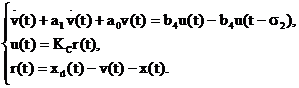Система уравнений для выходного сигнала прогнозатора Смита v(t) и входного сигнала объекта, прогнозатора и наблюдателя u(t):