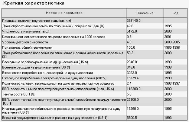 1. Финляндия (фин. Suomi, швед. Finland), Финляндская Республика (фин. Suome Tasavalta, швед. (Republike Finland), - государство на севере Европы, граничащая с Россией Норвегией и Швецией и имеющая выход к Ботническому и Финскому заливу Балтийского моря. Береговая линия страны составляет 4.5 тыс. кв. км., а удаленность от моря не в одной точке не превышает 300 км. По занимаемой площади (338 тыс. кв. км.) Финляндия превосходит такие Европейские государства, как Великобритания и Италия, стоя на 7 месте среди европейских стран. С севера на юг страна вытянута на 1160 км., с запада на восток - на 540 км. Омывается Финским и Ботническим заливом Балтийского моря; в составе Финляндии — Аландские о-ва. 337 тыс. км2. Население 5,2 млн. человек (2000), главным образом финны (около 94%), шведы. Городское население 62,5% (1993). Государственные языки — финский и шведский. Большинство верующих — лютеране. Столица — Хельсинки. В Финляндии проживают 6 500 саамов (лапландцев) Финляндия - буржуазная республика. Главой государства является президент республики, избираемый сроком на 6 лет. Президент может быть избран максимум на два срока правления подряд. Вместе с однопалатным парламентом он осуществляет законодательный функции. В составе парламента 200 депутатов, избираемого на 4 года на основе прямого и пропорционального голосования. Исполнительная высшая власть принадлежит Государственному совету, который образуют президент и правительство. Нынешнее правительство является коалиционным: социал-демократическая партия, национальная коалиционная партия, шведская народная партия, блок “левых” сил и партия “зеленых”. Из 18 министров, входящих в правительство - 6 женщин.