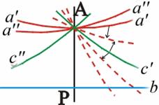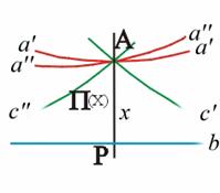 Итак, допустим, что пятый постулат неверен: через точку А, не принадлежащую прямой b, (рис. 11) можно провести более чем одну прямую, которая не пересекается с b. Пусть прямые а' и а'' не пересекаются с b. При их расположении как на рисунке будем поворачивать прямую а' по часовой стрелке. Тогда найдётся прямая с', которая последним образом прямой а' при этом движении, который не пересекает b. Значит прямые, получающиеся из с' при повороте по часовой стрелке на сколь угодно малый угол будут пересекать прямую b, а прямые, получающиеся из с' при малом повороте в обратном направлении, не будут пересекать b. Иначе говоря, среди всех прямых, проходящих через точку А, прямая с' отделяет пересекающие b прямые от прямых, не пересекающих её. Сама прямая с' не пересекает b. Такая же картина наблюдается и для прямой с'', симметричной с' относительно перпендикуляра AP, опущенного на b.