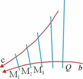 Затем Лобачевский рассматривает две параллельные прямые b и с и брёт на прямой b движущуюся точку М, удаляющуюся в сторону, обратную параллельности (рис. 15). В каждом положении точки М он восставляет перпендикуляр р к прямой b до его пересечения с прямой с. Длина перпендикуляра непрерывно возрастает при движении точки М, и, когда она попадает в некое положение Q, длина перпендикуляра становится бесконечной. Точнее говоря, перпендикуляр р, восставленный к прямой b в точке Q, параллелен прямой с (рис. 16). Построив прямую с1, симметричную с относительно перпендикуляра р, получим три прямые – b, с и с1, которые попарно параллельны друг другу (рис. 17). Возникает своеобразный «бесконечный треугольник»: у него каждые две стороны параллельны друг другу, а вершин совсем нет (они как бы находятся в бесконечности; рис. 18). Это уже никак не согласуется с привычными представлениями о расположении прямых линий, но противоречия и здесь нет.