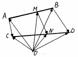 Пусть О - произвольная точка, не принадлежащая ни отрезку АВ, ни отрезку CD. Соединим точку О с точками А, М, В, С, N и D и раcсмотрим векторы