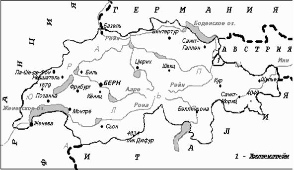 Между Бернскими Альпами и Юрой от протекающего по границе с Германией Рейна до Женевского озера тянется волнистое невысокое Швейцарское плоскогорье (высота 400-600 м), являющееся самой населенной частью страны. | |