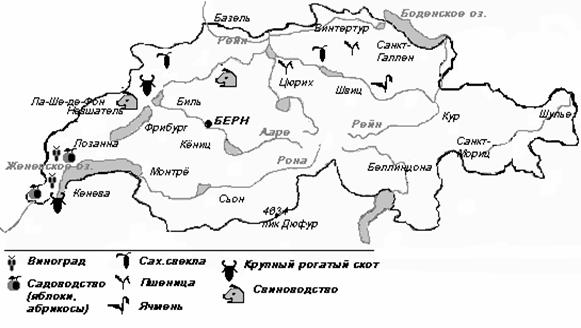 Страна производит 56,7 млрд. кВт/ч электроэнергии, 2/3 этого количества на ГЭС, 1/3 на АЭС. В сельском хозяйстве Швейцарии 3/4 с/х продукции приходится на животноводство. Поголовье крупного рогатого скота - 2 млн., свиней - 1,9 млн. На первом месте стоит производство молока, а затем уже мяса. На альпийских и субальпийских пастбищах шесть месяцев в году пасутся коровы знаменитой швицкой породы, дающие большие удои. Молоко почти полностью перерабатывается в сыр или масло. Сыр - один из важных предметов экспорта.