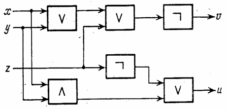 схемы, подсоединяя выходы одних элементов к входам других. Если при таких соединениях избегать возникновения замкнутых контуров (например, подсоединения выхода элемента на один из его собственных входов), то возникает класс схем, называемых обычно комбинационными схемами. Такие схемы находятся в однозначном соответствии с формулами булевой алгебры, так что с их помощью может быть выражена любая система булевых функций. Например, схема, изображенная на рис. 2, реализует систему булевых функций