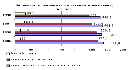 Большая часть экономически активного населения занята на государственных и муниципальных предприятиях. Уровень экономически активного населения с 1995 года остается почти неизменным - 55,5% -50% (1995 -1998 годы соответственно). Однако можно наблюдать тенденцию к увеличению уровня безработных, уровень которой повысился с 6,4% до 12, 64% и, соответственно, понизился уровень населения, занятого в экономике (с 93,6% до 87,36%).