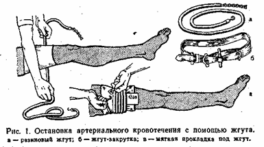 Первая помощь при наружном кровотечении: необходимо придать кровоточащей части тела возвышенное положение, наложить давящую повязку или жгут (выше места повреждения); при небольшом артериальном кровотечении достаточно применить плотную давящую повязку. Если это кровотечение обильное (алая кровь бьет непрерывной и сильной струей), нужно без промедления наложить кровоостанавливающий жгут (рис. 1).