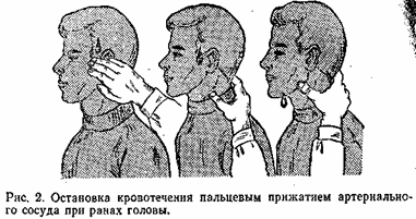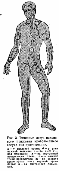 Для остановки кровотечения используют также способ пальцевого прижатия кровоточащего сосуда в типичном месте (рис. 2). Лучше всего, если удается прижать этот сосуд к кости.