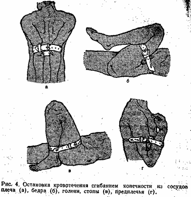 Для временной остановки кровотечения из сосудов конечностей можно использовать метод максимального сгибания конечности в суставах (рис. 4). При кровотечении из сосудов плеча руку заводят за спину и фиксируют ее повязкой. Если кровоточат сосуды предплечья, руку сгибают в локтевом суставе. При кровотечении из ран голени или стопы ногу сгибают максимально в коленном суставе и, придав конечности такое положение, ее надежно прибинтовывают.
