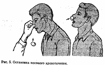 При кровотечении из носа пострадавшего нужно усадить так, чтобы голова находилась в вертикальном положении или была слегка отклонена назад; сжать нос на 2 – 3 мин; ввести в передний его отдел тампон, смоченный 3% раствором перекиси водорода; положить на область носа холодную примочку. Больному не рекомендуется дышать носом и сморкаться (рис. 5).