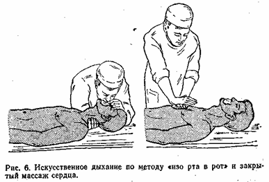 При оказании помощи двумя лицами проведение наружного массажа сердца и искусственного дыхания должно осуществляться синхронно, чтобы вдувание воздуха в легкие производилось в момент расслабления грудной клетки.