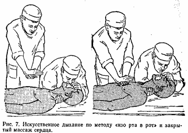 Если помощь оказывают 2 человека (рис. 7), то соотношение приемов должно быть 1:5. Один проводит наружный массаж сердца, другой – искусственное дыхание после каждого 5-го сдавливания грудины, в момент расправления грудной клетки. Если сердечная деятельность восстановилась, пульс стал отчетливым, лицо порозовело, массаж сердца прекращают, а искусственное дыхание продолжают в том же ритме до восстановления самостоятельного дыхания. При появлении у пострадавшего полноценного дыхания следует установить за ним постоянное наблюдение (до восстановления сознания). Следует помнить, что при отсутствии сознания возможны повторные расстройства дыхания вследствие западения языка и нижней челюсти.